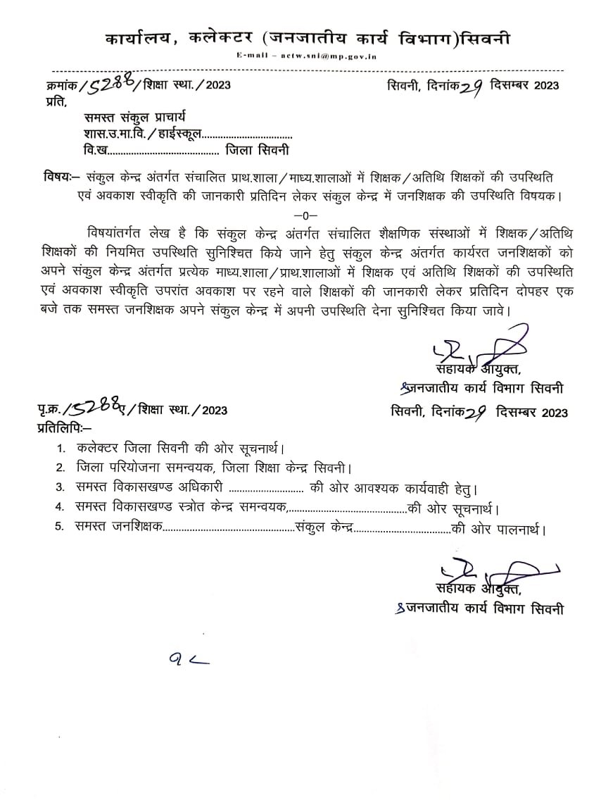 सिवनी। जिले के सरकारी जनजातीय विभाग के स्कूलो की गिरती साख सुधारने जिले के सहायक आयुक्त जनजातीय कार्य विभाग डाक्टर अमर सिंह उईके द्वारा कलेक्टर के निर्देश पर सतत स्कूलों का दौरा कर लापरवाह शिक्षको के ऊपर कार्यवाही की जा रही है। जिससे सुधार दिख रहा है। परंतु इस सुधार में सबसे अहम कड़ी जनशिक्षक की है। जिसमे सुधार हेतु सभी जनशिक्षक अपनी उपस्थिति जनशिक्षा केंद्र में देगे और जनशिक्षा केंद्र के अधीन सभी प्राथमिक शाला माध्यमिक शाला में पदस्थ शिक्षक, अतिथि शिक्षक की प्रतिदिन कितने उपस्थित है। कितने अवकाश में है की जानकारी स्कूल प्राचार्य, जनशिक्षा केंद्र प्रभारी प्राचार्य को देगे 1 बजे तक, प्रतिदिन क्योंकी सहायक आयुक्त जनजातीय विभाग के डाक्टर अमर सिंह उईके और घंसौर बीडीओ प्रेसन दीक्षित सयुक्त दौरा घंसौर के अति पिछड़े डूब क्षेत्र जनशिक्षा केंद्र झिंझरई का दौरा किए और 22 वर्षो से नियम विरुद्ध जनशिक्षक पदस्थ है।
