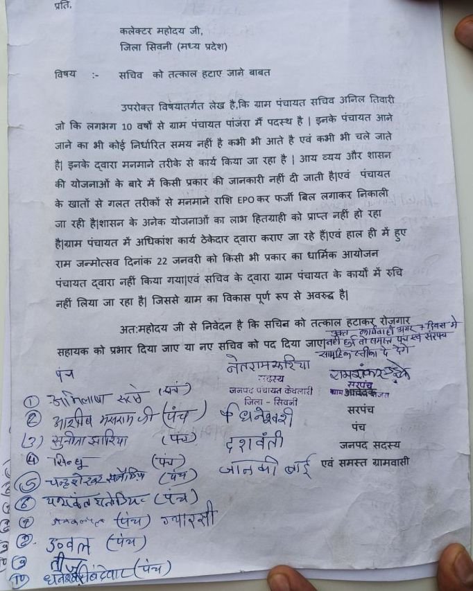 ग्राम वासियों ने कलेक्टर से मांग करते हुए कहा कि सचिव को तत्काल हटाने की कार्यवाही की जाए।