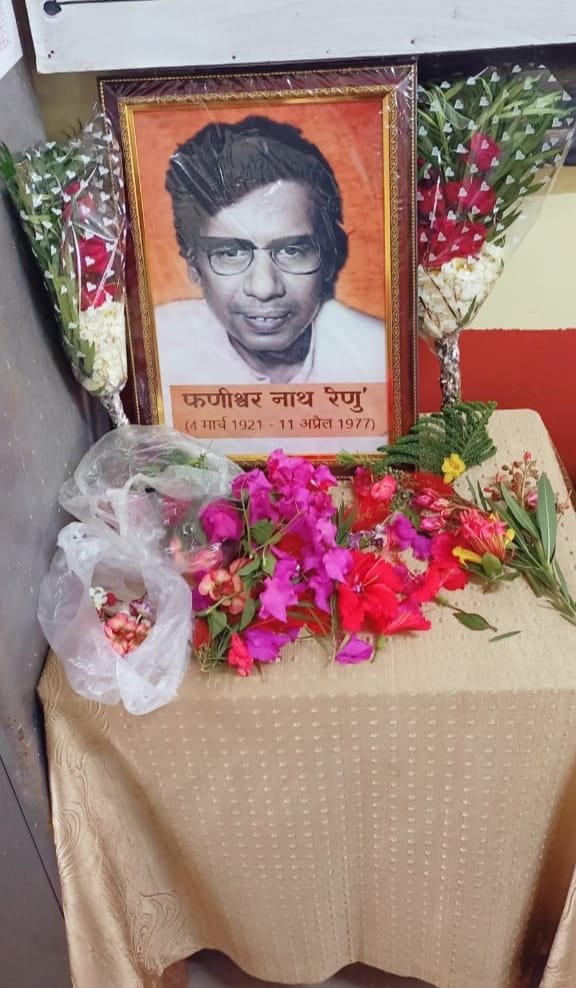 हिंदी विभाग के प्रेमचंद कक्ष में आयोजित कार्यक्रम की शुरुआत में फणीश्वरनाथ रेणु के छायाचित्र पर हिंदी परिषद् के छात्र पदाधिकारियों , शिक्षकों और प्राध्यापकों ने पुष्प अर्पित किये।
