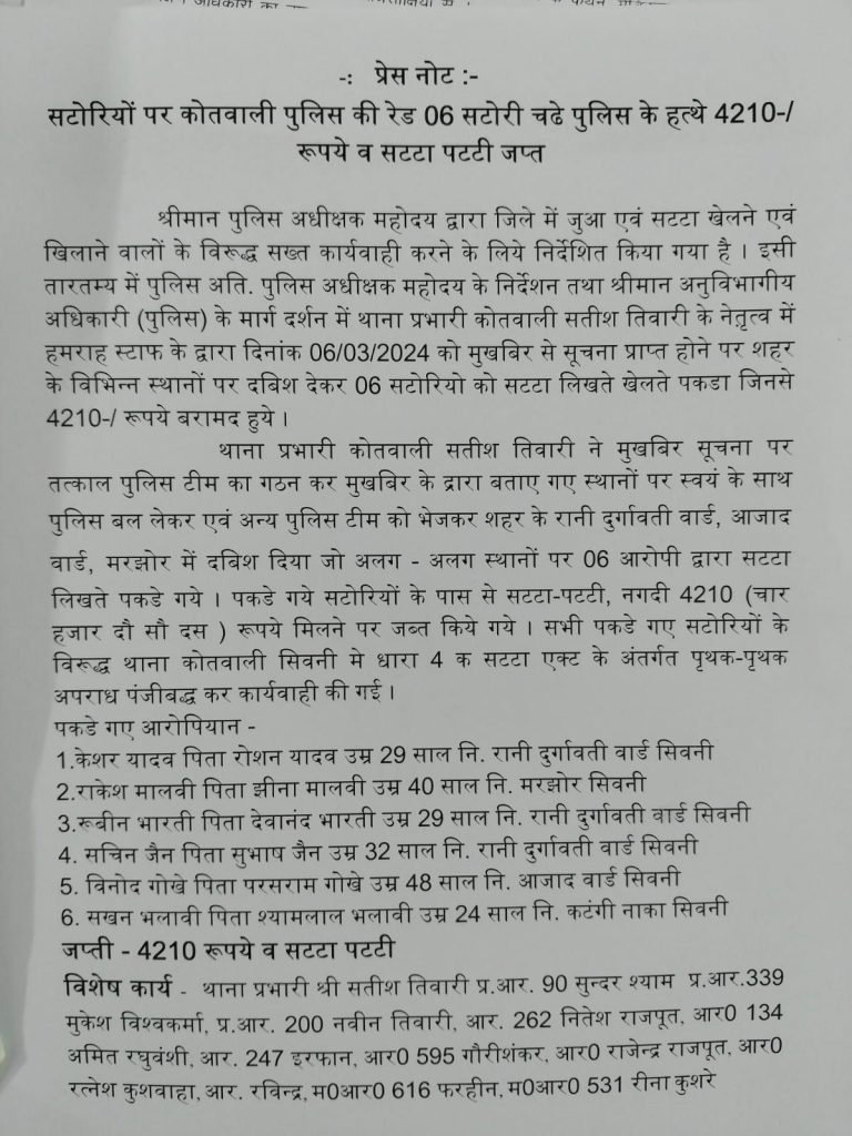 सिवनी। पुलिस अधीक्षक द्वारा जिले में जुआ एवं सट्टा खेलने एवं खिलाने वालों के विरुद्ध सख्त कार्यवाही करने के लिये निर्देशित किया गया है। इसी तारतम्य में पुलिस अति. पुलिस अधीक्षक के निर्देशन तथा अनुविभागीय अधिकारी (पुलिस) के मार्गदर्शन में थाना प्रभारी कोतवाली सतीश तिवारी के नेतृत्व में हमराह स्टाफ के द्वारा दिनांक 06/03/2024 को मुखबिर से सूचना प्राप्त होने पर शहर के विभिन्न स्थानों पर दबिश देकर 06 सटोरियो को सटटा लिखते खेलते पकड़ा जिनमे 4210-/ रुपये बरामद हुये।