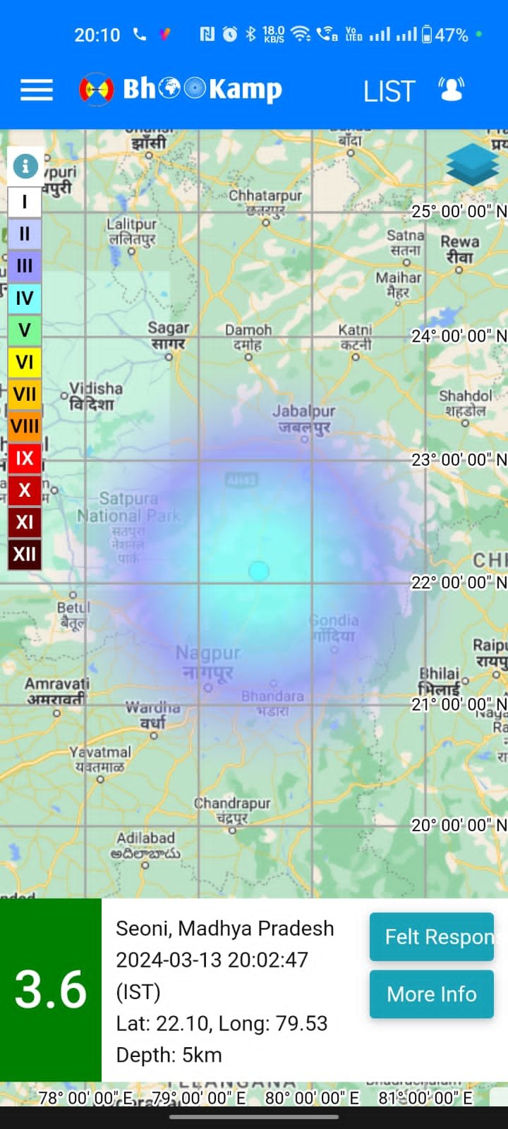 सिवनी। बुधवार की रात करीब 8 बजकर 2 मिनिट में तेज धमाके के साथ करीब 5 सेकेंड तक धरती में कंपन हुआ। रिक्टर पैमाने पर 3.6 तीव्रता का भूकंप दर्ज किया गया है। वहीं भूकंप के झटके से लोग घबराकर घर से बाहर निकले। बता दें इससे पहले भी सिवनी में कई बार भूकंप के झटके महसूस किए गए हैं। जिला प्रशासन भारतीय मौसम विज्ञान के वरिष्ठ वैज्ञानिकों के संपर्क में हैं।