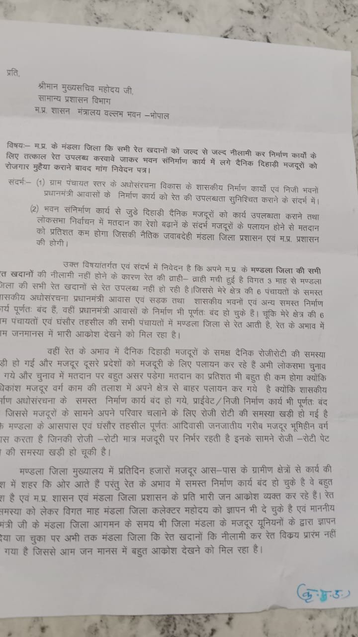 मंडला। जिले के समाजसेवी नारायण बैजनाथ सिंह ने मजदूरों की पीड़ा और पलायन रोकने जनहित में सरकारी और प्राइवेट निर्माण पिछले तीन माह से रुके है। वही मजदूर होली में बाहर से काम में अपने घर वापस आए हैं पुनः बाहर जाने वाले है। वर्तमान में लोक सभा चुनाव है। और चुनाव आयोग बोटिंग बढ़ाने प्रचार प्रसार कर करोड़ों खर्च कर रहा है। परंतु मंडला में पिछले तीन माह से रेत नही मिल रही मजदूरों को रोजी रोटी का संकट है। फिर वोटिंग केसे इसलिए समाज सेवी संज्ञान में लिए पीड़ित मजदूरों की समस्या को देखते हुए तत्काल प्रभाव से अति आवश्यक अधिनियम की धारा को ध्यान में रखते हुए मजदूरों को रोजगार मिले पलायन रुके हेतु मंडला जिला पंचायत सी ई और कलेक्टर मंडला,कमिश्नर जबलपुर, प्रमुख सचिव माइनिंग, मुख्य सचिव मध्य प्रदेश, महामहिम राज्यपाल, प्रधानमंत्री भारत सरकार, महामहिम राष्ट्रपति भारत सरकार को निवेदन पत्र लिख तत्काल रेत की उपलब्धता की मांग जनहित में की है।