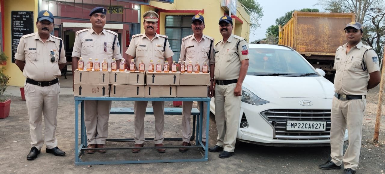 जप्तिः- 1.08 पेटी देशी मसाला शराब कीमती 40000/- रू. 2. हुंडई 110 कार क्रं. MP-22-CA-8271 (कीमती करीब 05 लाख)