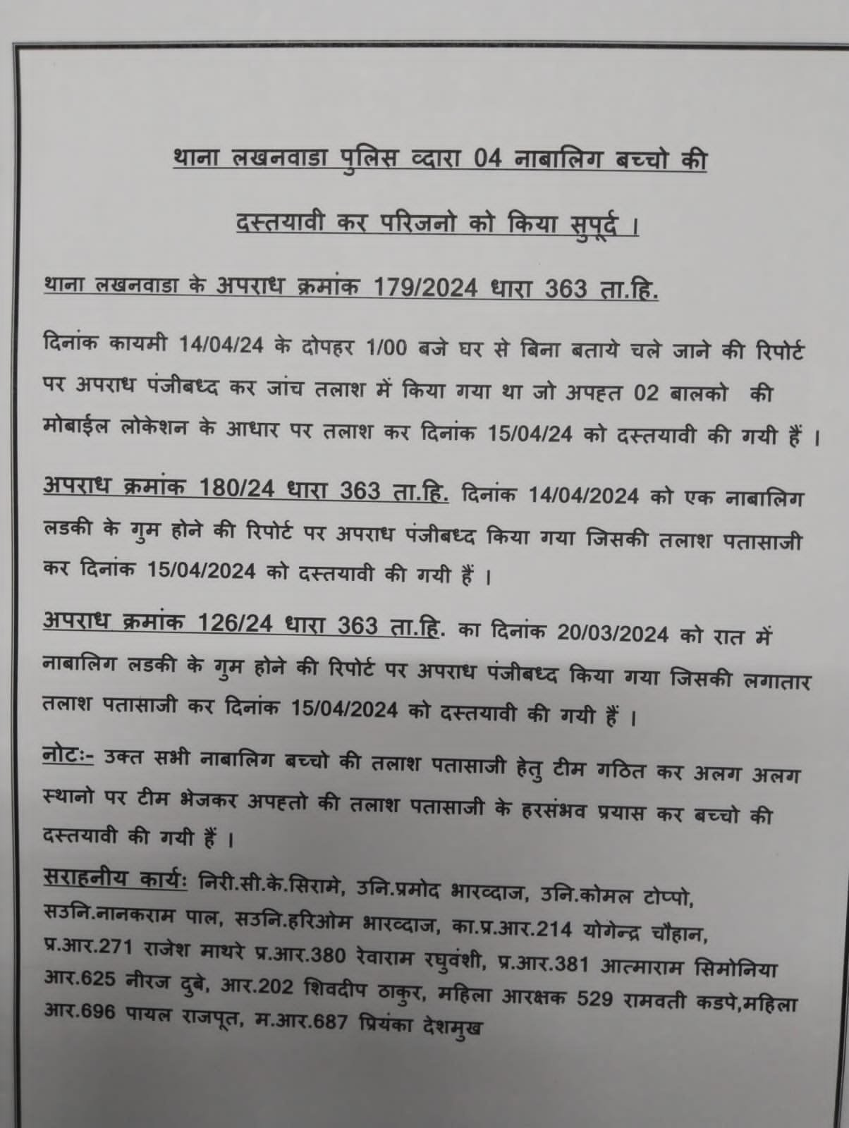 सिवनी। लखनवाड़ा थाना अंतर्गत गांव के एक नाबालिक बच्ची व अन्य लापता हुए बच्चों को पुलिस ने तलाश कर उनके परिजनों को सौंप दिया है। नाबालिक बच्चे 14 अप्रैल को दोपहर 1 बजे घर से बिना बताए कहीं चले गए थे जिसके चलते बच्चों के माता-पिता परिजन अत्यधिक परेशान वह चिंतित हुए जिन्होंने अपने नाबालिक बच्चों के लापता होने की सूचना लखनवाड़ा थाने में दी जिसके चलते लखनवाड़ा पुलिस ने इस मामले को गंभीरता से लेते हुए अपनी तत्परता दिखाते हुए नाबालिक बच्चों की पतासाजी कर बच्चों को उनके माता-पिता के सुपुर्द किया।