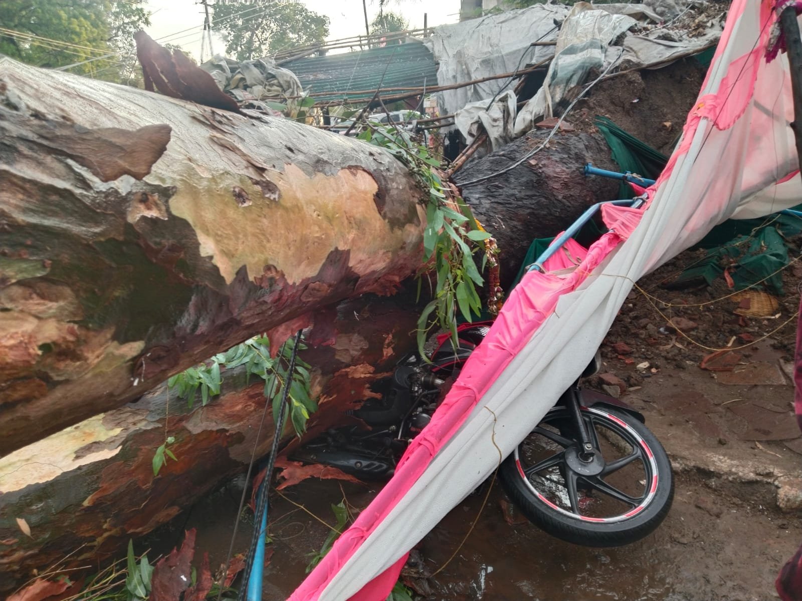 इसके साथ ही नगर के टैगोर वार्ड स्थित हरिजन कल्याण थाना आजक थाना के सामने लगा वर्षों पुराना नीलगिरी का पेड़ तेज हवाओं की चपेट में आने से गिर गया। पेड़ की गिरने से बिजली के तार व खंबे टूट गए। वहीं पेड़ की साख पर सड़क किनारे खड़ी एक बाइक भी चपेट में आ गई और वह पेड़ की साख में दब गई। वहीं पेड़ गिरने के बाद से आवागमन बंद हो गया इसके साथ ही बिजली के तार जमीन पर गिर गए। सुरक्षा की दृष्टि से इलाके की विद्युत आपूर्ति बंद कर दी गई है वहीं पेड़ की साख काटने का काम शुरू कर दिया गया। पुलिस प्रशासन मौके पर पहुंच कर यहां से गुजरने वाले वाहनों को दूसरे मार्ग से जाने आने के लिए निर्देश देते रहे।