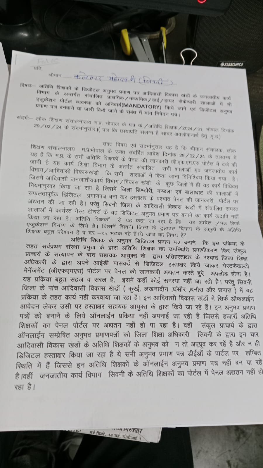 इसी मामला को समाजसेवी संज्ञान लिए और सिवनी के कलेक्टर क्षितिज सिंघल जी कमिश्नर जबलपुर,के साथ आयुक्त ट्रेयवल मध्यप्रदेश, प्रमुख सचिव, मुख्य सचिव, आयुक्त लोकशिक्षण, डी पी आई, मुख्यमंत्री को पत्र लिखा की तत्काल समस्त आदेश निर्देश सहायक आयुक्त जनजातीय सिवनी को दिए जावे और समय सीमा में सभी अतिथि शिक्षको के डिजिटल अनुभव प्रमाण पत्र जारी किए जावे। यदि कोई अतिथि शिक्षक डिजिटल अनुभव प्रमाण पत्र के अभाव में कोई शासकीय लाभ से बांचित होता तो इसकी समस्त जाबदेही जिला प्रशासन की होगी।