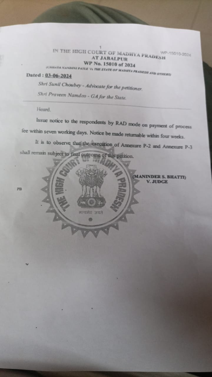 जब संगठन की इन बातों को उच्च अधिकारियों द्वारा अनसुना किया गया तो मध्य प्रदेश शिक्षक संघ जबलपुर संभाग के मार्गदर्शन में सिवनी जिले के दो शिक्षकों के द्वारा माननीय उच्च न्यायालय जबलपुर में याचिका दायर की गई की विभाग द्वारा उनके नाम को छोड़कर उनसे कनिष्ठ प्राथमिक शिक्षकों को उच्च पद का प्रभाव सौंप दिया गया है। जिस पर उच्च न्यायालय ने आयुक्त आदिम जाति कल्याण विभाग उपायुक्त जबलपुर संभाग तथा सहायक आयुक्त आदिवासी विकास शिवानी को नोटिस जारी कर सात दिवस के अंदर उच्च पद के प्रभार में आ रही कमियों पर अपना जवाब प्रस्तुत करने की बात कही है तथा माननीय न्यायालय ने यह भी निर्देश दिए हैं कि उच्च पद के प्रभार की प्रक्रिया न्यायालय के मार्गदर्शन में ही पूर्ण की जाए तथा किसी भी वरिष्ठ को छोड़कर कनिष्ठ को उच्च पद का प्रभार ना सोपा जाए।