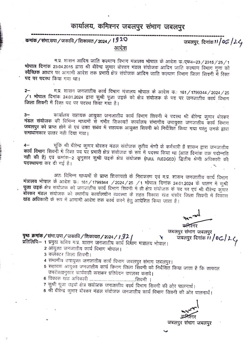 विभिन्न माध्यमों से प्राप्त शिकायतो के निराकरण एवं म.प्र. शासन जनजातीय कार्य विभाग मंत्रालय भोपाल के आदेश कः 161/1799344/2024/25/1 भोपाल दिनांक 24.01.2024 के पालन में शुश्री पूजा उइके क्षेत्र संयोजक को जनजातीय कार्य विभाग सिवनी में ही क्षेत्र संयोजक के पद पर एवं श्री बीरेन्द्र कुमार बोरकर मंडल संयोजक को स्थानीय कार्यालयीन व्यवस्था के तहत विकास खंड घंसौर जिला सिवनी में विकास खंड अधिकारी के रूप में आगामी आदेश तक कार्य करने हेतु आदेशित किया जाता है।