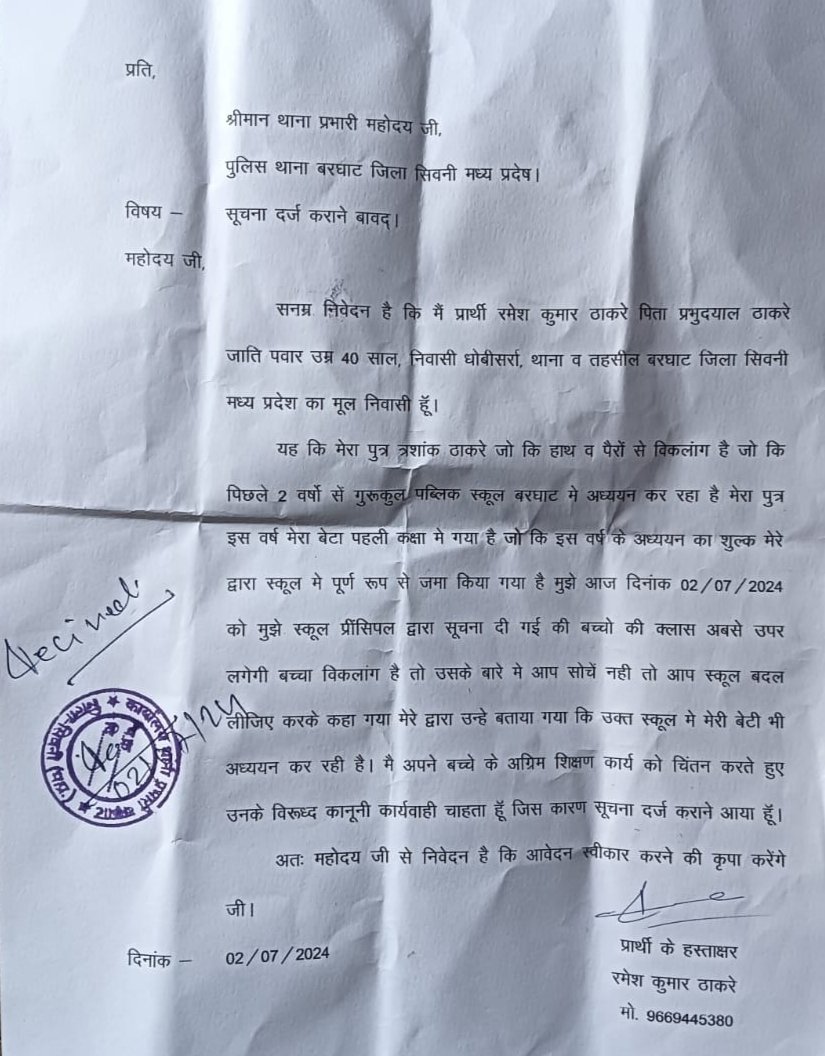 मुझे आज दिनांक 02/07/2024 को मुझे स्कूल प्रींसिपल द्वारा सूचना दी गई की बच्चो की क्लास अबसे उपर लगेगी। बच्चा दिव्यांग है तो उसके बारे मे आप सोचें नही तो आप स्कूल बदल लीजिए करके कहा गया। मेरे द्वारा उन्हें बताया गया कि उक्त स्कूल में मेरी बेटी भी अध्ययन कर रही है। मैं अपने बच्चे के अग्रिम शिक्षण कार्य को चिंतन करते हुए उनके विरूध्द कानूनी कार्यवाही चाहता हूँ जिस कारण सूचना दर्ज कराने आया हूँ।