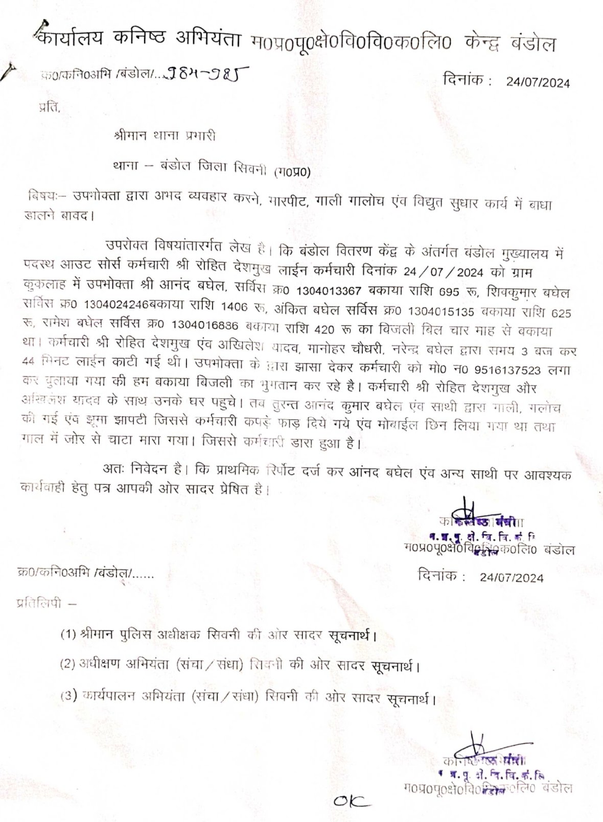 पीड़ित कर्मचारियों ने बताया कि मै ग्राम पांढरवानी थाना अरी जिला सिवनी हाल मुकाम बंडोल रहता हूं। विद्युत वितरण केन्द्र बंडोल पर मीटर वाचक के पद पर पदस्थ हूं।
