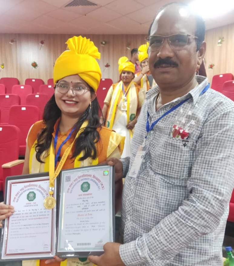 सिवनी/खेरापलारी। राजा शंकर शाह यूनिवर्सिटी छिंदवाड़ा में दिनांक 27 सितंबर दिन शुक्रवार को दीक्षांत समारोह में रामभरोस साहू की सुपुत्री नीलू साहू को (M.A. Philosophy) एम ए फिलोसोफे मे गोल्ड मेडल प्राप्त करने पर राजपाल द्वारा सम्मानित किया गया गवर्नर राज्यपाल द्वारा राजा शंकर शाह यूनिवर्सिटी छिंदवाडा मे नीलू साहू ने परिवार के साथ-साथ समाज को गौरवांवित किया।