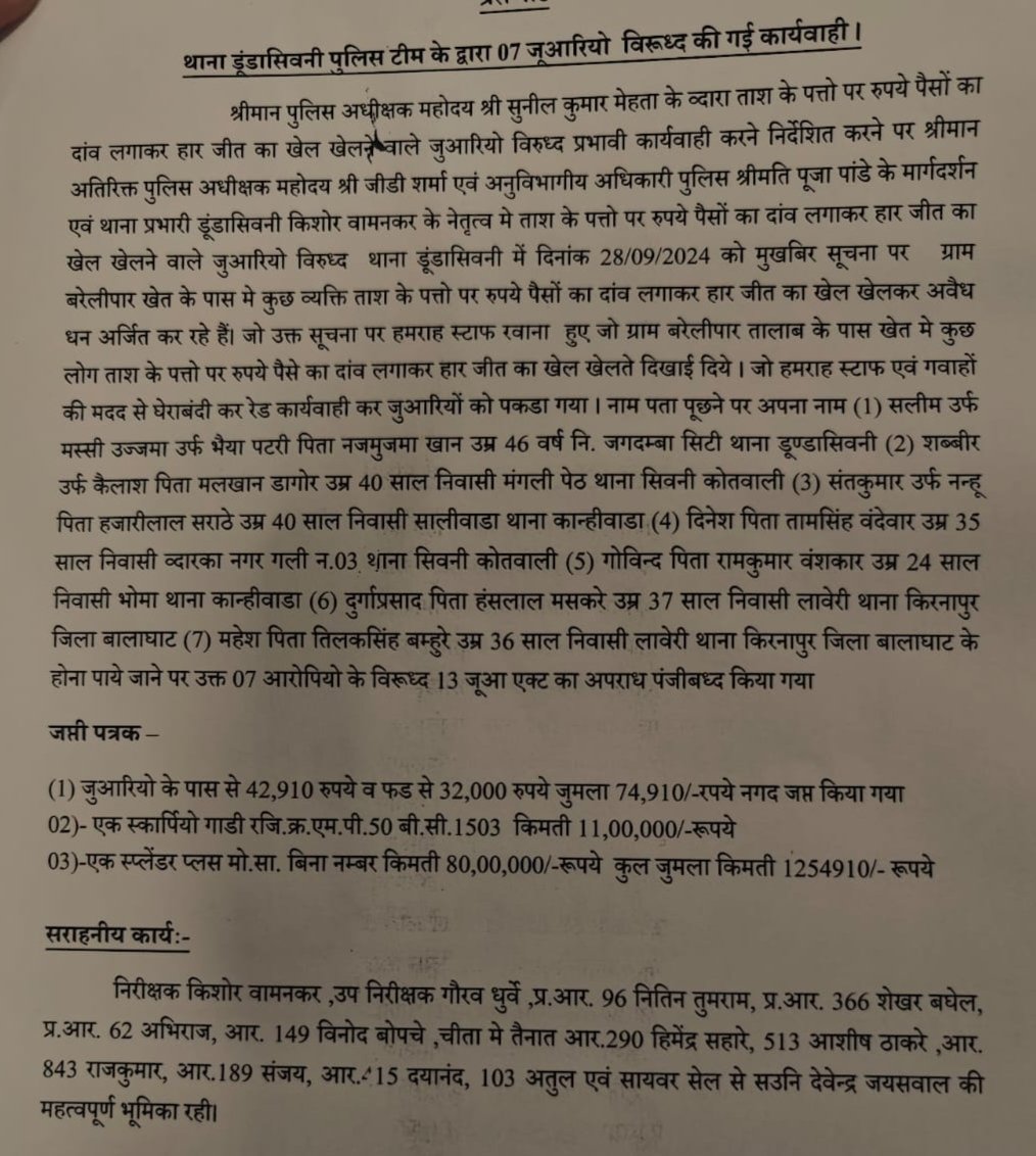 सिवनी। पुलिस अधीक्षक सुनील कुमार मेहता के व्दारा ताश के पत्तो पर रुपये पैसों का दांव लगाकर हार जीत का खेल खेलने वाले जुआरियो विरुध्द प्रभावी कार्यवाही करने निर्देशित करने पर अतिरिक्त पुलिस अधीक्षक जीडी शर्मा एवं अनुविभागीय अधिकारी पुलिस श्रीमति पूजा पांडे के मार्गदर्शन एवं थाना प्रभारी डूंडासिवनी किशोर वामनकर के नेतृत्व मे ताश के पत्तो पर रुपये पैसों का दांव लगाकर हार जीत का खेल खेलने वाले जुआरियो विरुध्द थाना डूंडासिवनी में दिनांक 28/09/2024 को मुखबिर सूचना पर ग्राम बरेलीपार खेत के पास मे कुछ व्यक्ति ताश के पत्तो पर रुपये पैसों का दांव लगाकर हार जीत का खेल खेलकर अवैध धन अर्जित कर रहे हैं। जो उक्त सूचना पर हमराह स्टाफ रवाना हुए जो ग्राम बरेलीपार तालाब के पास खेत मे कुछ लोग ताश के पत्तो पर रुपये पैसे का दांव लगाकर हार जीत का खेल खेलते दिखाई दिये।