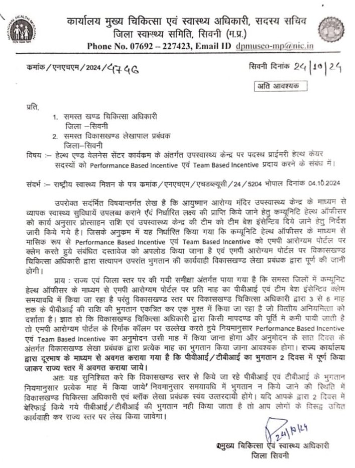 उपरोक्त सदर्भित विषयान्तर्गत लेख है कि आयुष्मान आरोग्य मंदिर उपस्वास्थ्य केन्द्र के माध्यम से व्यापक स्वास्थ्य सुविधायें उपलब्ध कराने एवं निर्धारित लक्ष्य की प्राप्ति किये जाने हेतु कम्यूनिटि हेल्थ ऑफीसर को कार्य अनुसार प्रोत्साहन राशि एवं उपस्वास्थ्य केन्द्र की टीम को टीम बेश इंसेन्टिव दिये जाने हेतु निर्देश जारी किये गये है। जिसके अनुक्रम में यह निर्धारित किया गया कि कम्यूनिटि हेल्थ ऑफीसर के माध्यम से मासिक रूप से Performance Based Incentive एवं Team Based Incentive को एमपी आरोग्यम पोर्टल पर क्लेम करते हुये संबंधित दस्तावेज को अपलोड किया जाना है एवं एमपी आरोग्यम पोर्टल पर विकासखण्ड चिकित्सा अधिकारी द्वारा सत्यापन उपरांत भुगतान की कार्यवाही विकासखण्ड लेखा प्रबंधक द्वारा पूर्ण की जानी होगी।