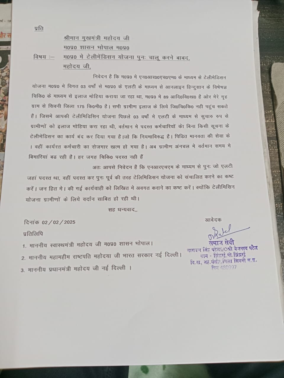 सिवनी। जिले की सरहद नर्मदांचल बरगी बांध डूब क्षेत्र घंसौर विकाश खंड के ग्राम पंचायत झिंझरई निवासी समाज सेवी नारायण बैजनाथ सिंह पटेल ने पीड़ित मानवता की सेवा के लिए महामहिम राष्ट्रपति, प्रधानमंत्री भारत सरकार नई दिल्ली, ओर मुख्यमंत्री, स्वास्थ्य मंत्री मध्यप्रदेश सरकार को पत्र लिख कर निवेदन किया कि निगत तीन वर्षों से मध्यप्रदेश में NRHM के माध्यम से एल. टी को पदस्त कर ग्रामीणों को ऑनलाइन हिंदुस्तान के विशेषज्ञ डॉक्टर से इलाज दिया जा रहा था और यह योजना ग्रामीणों के लिए वरदान साबित हो रही थी, परन्तु बिना किसी सूचना के टेलीमेडिसन योजना बंद कर दी गई।