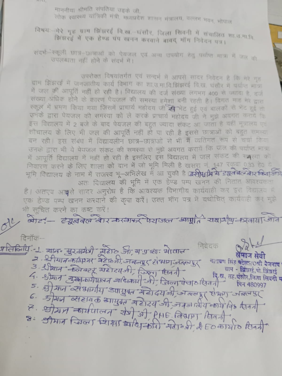 भीषण गर्मी ओर जल संकट को देखते हुए झिंझरई निवासी समाज सेवी नारायण बैजनाथ सिंह पटेल ने जिला कलेक्टर, ,सहायक आयुक्त जनजातीय सिवनी, जिला पंचायत मुख्यकार्यपालन अधिकारी सिवनी, जिला शिक्षा अधिकारी, ओर कार्यपालन यात्री पी एच ई सिवनी, कमिश्नर जबलपुर,मुख्यमंत्री मध्यप्रदेश शासन भोपाल ओर लोक स्वास्य यांत्रिकी मंत्री मध्यप्रदेश शासन को पत्र लिख कर निवेदन किए कि हायर सेकेंडरी स्कूल झिंझरई के खसरा नंबर 147 रखवा 0.33 हेक्टर में हैंडपंप खनन कराकर छात्र /छात्रों को पेयजल उपलब्ध करने का कष्ट करे का निवेदन समाज सेवी ने किया।