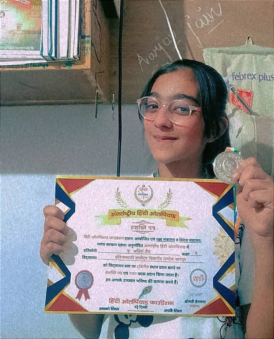 सिवनी। नगर के चिकित्सक दम्पत्ति डाक्टर अपूर्व, डॉक्टर अनुभा जैन की बिटिया अनिर्वा जैन ने अंतरराष्ट्रीय हिंदी ओलंपियाड में हिंदी ओलंपियाड फाउंडेशन द्वारा आयोजित, रक्षामंत्रालय व विदेश मंत्रालय भारत सरकार द्वारा अनुमोदित प्रतियोगिता में प्रतिभास्थली ज्ञानोदय विद्यापीठ रामटेक नागपुर की कक्षा आठवीं के छात्रा के रूप में विद्यालय स्तर पर द्वितीय स्थान प्राप्त किया।