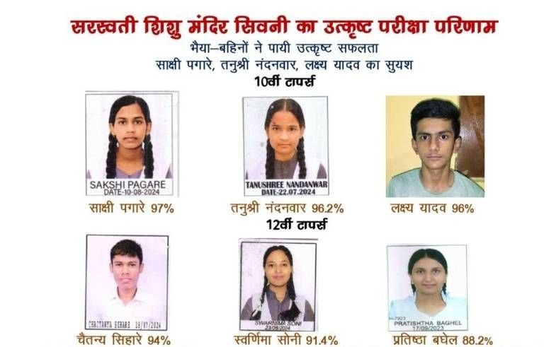 माध्यमिक शिक्षा मण्डल म.प्र भोपाल द्वारा घोषित हाईस्कूल/हायरसेकेण्डरी परीक्षा परिणामों में सरस्वती शिशु मंदिर भैरोगंज सिवनी के छात्रों ने उत्कृष्ट सफलता हासिल करते हुए, संस्था के उच्च शैक्षणिक स्तर को प्रमाणित किया है। हाईस्कूल परीक्षा में संस्था के 108 छात्रों ने सफलता हासिल की। इनमें से 08 छात्र 90 प्रतिशत से अधिक अंक लेकर उत्तीर्ण हुए है। जिसमें प्रथम स्थान साक्षी पगारे ने 97 प्रतिशत अंको के साथ प्राप्त किया है जबकि द्वितीय स्थान तनुश्री नंदनवार ने 96.2 प्रतिशत अंको के साथ प्राप्त किया है। वही तृतीय स्थान लक्ष्य यादव ने 96 प्रतिशत अंको के साथ प्राप्त किया है। इसके अतिरिक्त बहिन गरिमा नरेती 93.4 प्रतिशत, सूर्यांश राय 93 प्रतिशत, रोशनी सनोडिया 92.4 प्रतिशत, दीक्षा राय 91 प्रतिशत, मोक्षिमा जैन 892 प्रतिशत एवं चंद्रकांत अहाके ने 89.2 प्रतिशत, सोनाली कुल्हाडे 87 प्रतिशत, सत्यम बघेल 86.8 प्रतिशत, दीपिका डहेरिया 85.6 प्रतिशत अंको के साथ उल्लेखनीय सफलता हासिल की है।