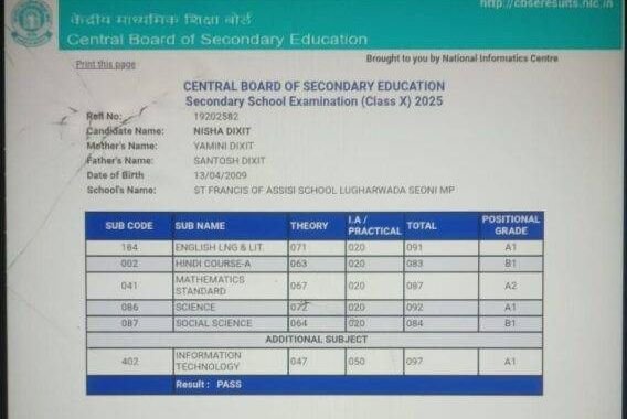 सिवनी। नगर के झूलेलाल कॉलोनी निवासी सेंट फ्रांसिस ऑफ़ असीसी स्कूल सिवनी की छात्रा निशा दीक्षित माँ श्रीमती यामिनी-संतोष दीक्षित ने कक्षा 10वीं CBSC में 90% अंक प्राप्त की। छात्रा की इस सफलता पर सभी ने शुभकामनाएं, बधाई दी व छात्रा के उज्जवल भविष्य की कामना की है।