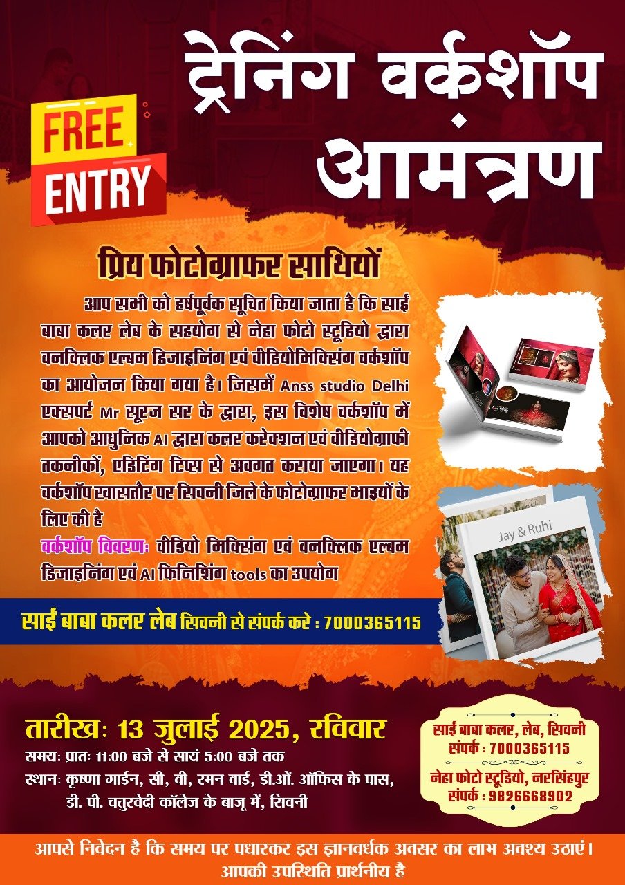 इस विशेष वर्कशॉप में आधुनिक AI द्वारा कलर करेक्शन एवं वीडियोग्राफी तकनीकों, एडिटिंग टिप्स से अवगत कराया जाएगा। यह वर्कशॉप खासतौर पर सिवनी जिले के फोटोग्राफर के लिए की है।