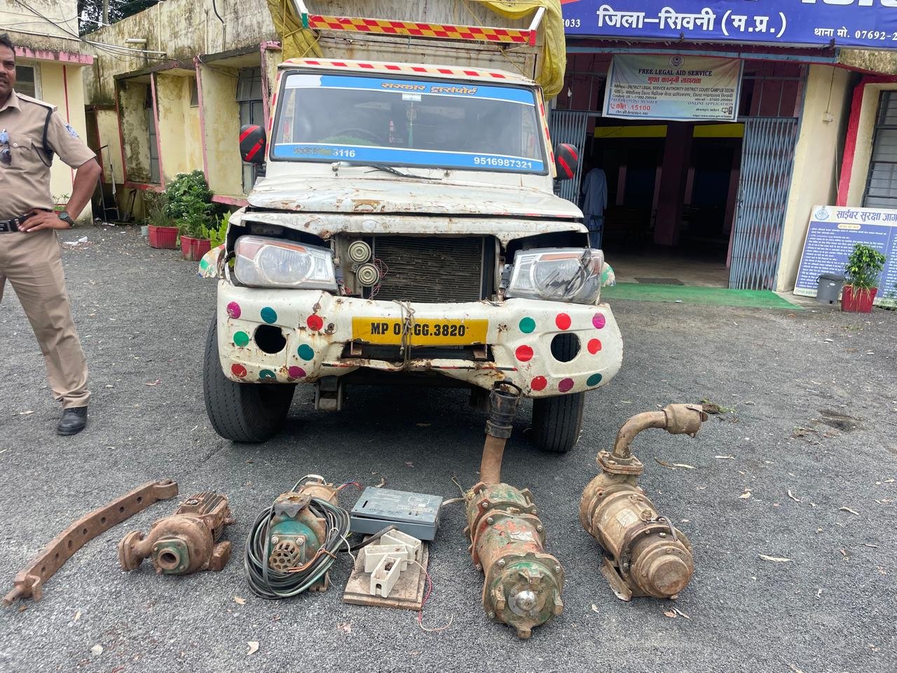 दौरान विवेचना ग्राम बलारपुर एव आसपास की रोड मे लगे हुए सीसीटीवी केमरो के माध्यम से अज्ञात चोर की तलाश की गयी जो एक संदीग्ध पिकअप वाहन मे चोर मोटर चोरी करते हुए दिखाई दिये जो तकनीकी साक्ष्यो के आधार पर पिकअप वाहन एंव आरोपीयो की तलाश कर आरोपी संदेही सुनील पिता रिक्खीराम राय उम्र 40 वर्ष निवासी ग्राम छिड़ीया पलारी थाना डूण्डासिवनी से सख्ती से पूछताछ की गई जिसने घटना दिनाँक 26-08-25 की मध्य रात्रि मे अपने साथी विकास डहेरिया निवासी टपरा मौहल्ला जनता नगर के साथ मिलकर संदीप साहू के खेत से पनडुब्बी मोटर एवं खेती का सामान चोरी करना स्वीकार किया जो आरोपी सुनील राय से चोरी की गई चार पनडुब्बी मोटर एवं खेती का सामान कीमती 88000 रूपये एवं घटना मे प्रयुक्त पिकअप वाहन क्र MP09GG3820 कीमती 400000 रूपये कुल मशरूका 488000 रूपये जप्त कर कब्जा पुलिस मे लिया गया है, व आरोपी को गिरफ्तार कर माननीय न्यायालय सिवनी पेश कर जेल दाखिल कराया।