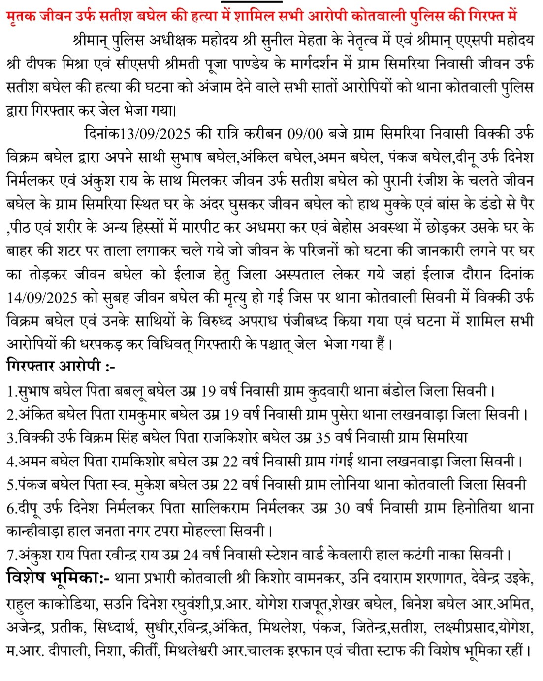 दिनांक 13/09/2025 की रात्रि करीबन 09/00 बजे ग्राम सिमरिया निवासी विक्की उर्फ विक्रम बघेल द्वारा अपने साथी सुभाष बघेल, अंकिल बघेल, अमन बघेल, पंकज बघेल, दीनू उर्फ दिनेश निर्मलकर एवं अंकुश राय के साथ मिलकर जीवन उर्फ सतीश बघेल को पुरानी रंजीश के चलते जीवन बघेल के ग्राम सिमरिया स्थित घर के अंदर घुसकर जीवन बघेल को हाथ मुक्के एवं बांस के डंडो से पैर , पीठ एवं शरीर के अन्य हिस्सों में मारपीट कर अधमरा कर एवं बेहोस अवस्था में छोड़कर उसके घर के बाहर की शटर पर ताला लगाकर चले गये जो जीवन के परिजनों को घटना की जानकारी लगने पर घर का तोड़कर जीवन बघेल को ईलाज हेतु जिला अस्पताल लेकर गये जहां ईलाज दौरान दिनांक 14/09/2025 को सुबह जीवन बघेल की मृत्यु हो गई जिस पर थाना कोतवाली सिवनी में विक्की उर्फ विक्रम बघेल एवं उनके साथियों के विरुध्द अपराध पंजीबध्द किया गया एवं घटना में शामिल सभी आरोपियों की धरपकड़ कर विधिवत् गिरफ्तारी के पश्चात् जेल भेजा गया हैं।