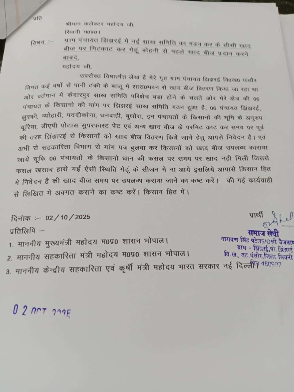 जिस झिंझरई निवासी समाज सेवी नारायण बैजनाथ सिंह पटेल ने जिला कलेक्टर सिवनी, सहकारिता मंत्री मध्यप्रदेश केंद्रीय सहकारिता मंत्री अमित शाह को निवेदन पत्र लिखा मेरे क्षेत्र के किसानों को गेहूं बौनी से पहले सभी किसानों को परमिट काटकर।