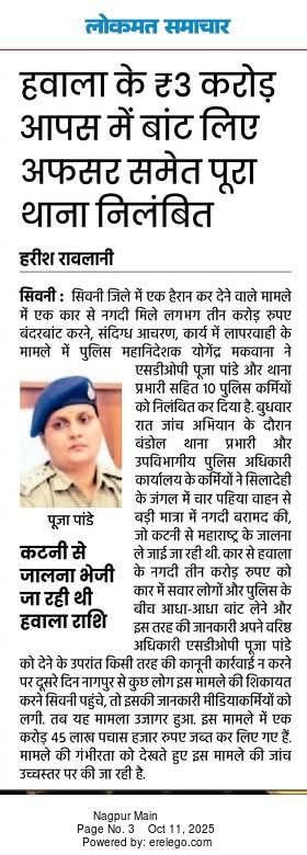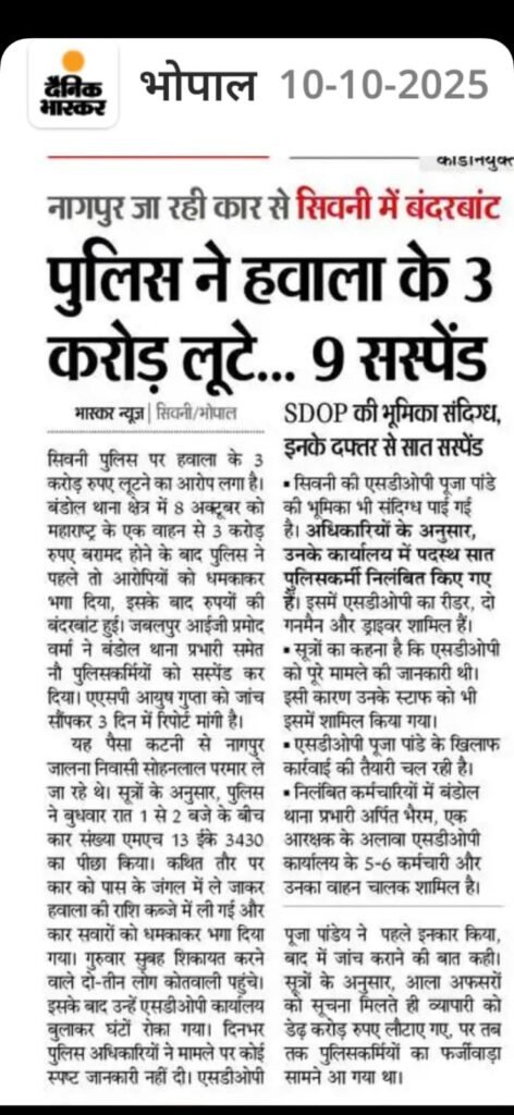 मामला दिनांक 8 अक्टूबर 2025 की रात का बताया जा रहा है, जब एनएच-44 शीलादेही बायपास सिवनी में पुलिस द्वारा की जा रही चेकिंग के दौरान एक बड़ी रकम बरामद की गई थी। प्रारंभिक जांच में इस राशि को लेकर कई संदेहास्पद परिस्थितियाँ सामने आईं, जिसके बाद पूरा मामला उच्च अधिकारियों तक पहुंचा।