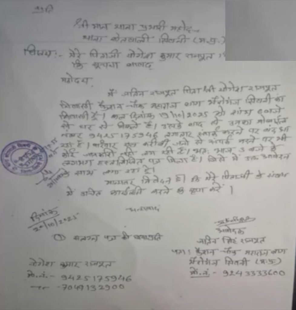 पुलिस कर रही जांच – कोतवाली टीआई किशोर वामनकर का कहना है कि रविवार को प्रधान आरक्षक योगेश राजपूत के परिजनों ने उनके लापता होने की शिकायत की है। वहीं एक पत्र भी दिया है। पुलिस मामले की जांच कर रही है।