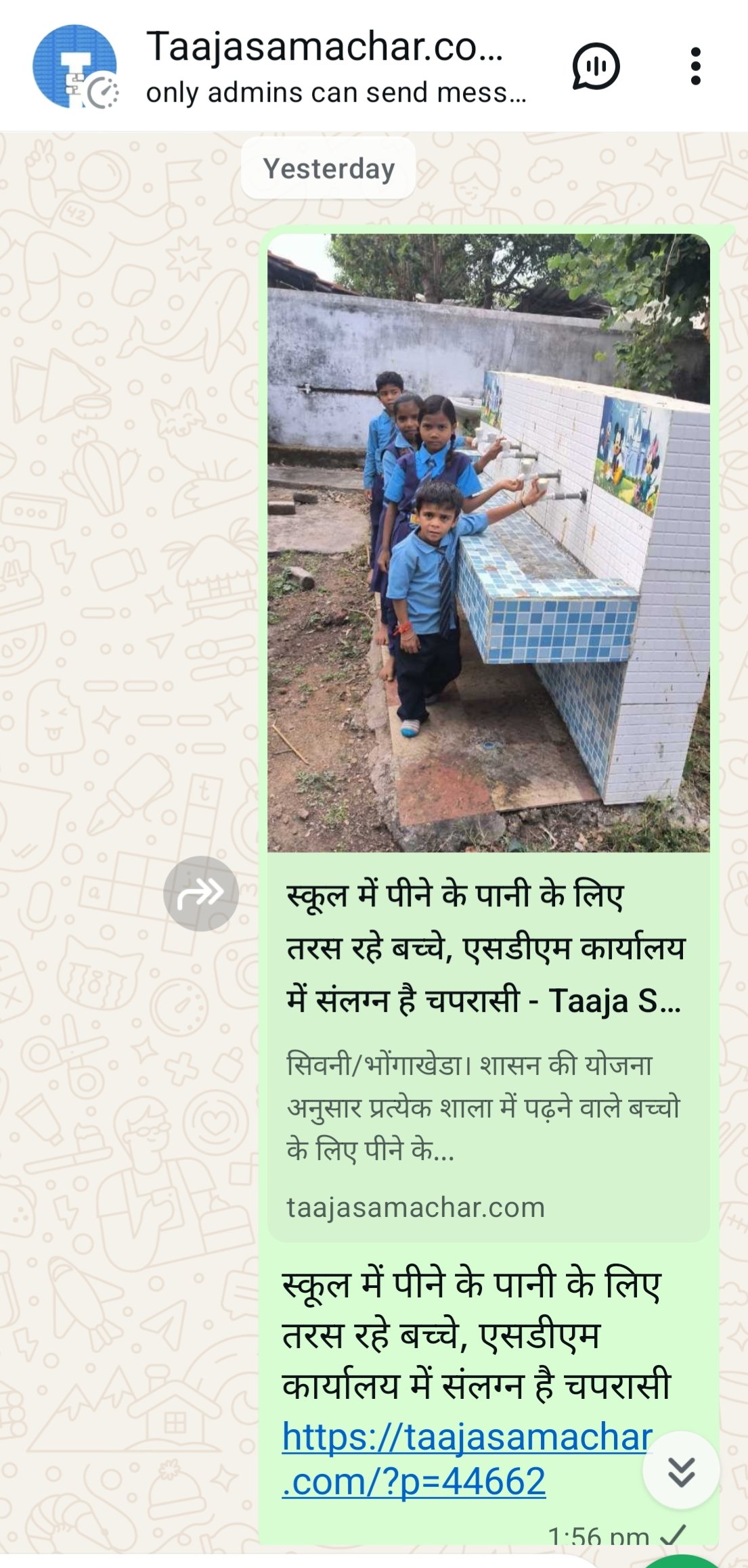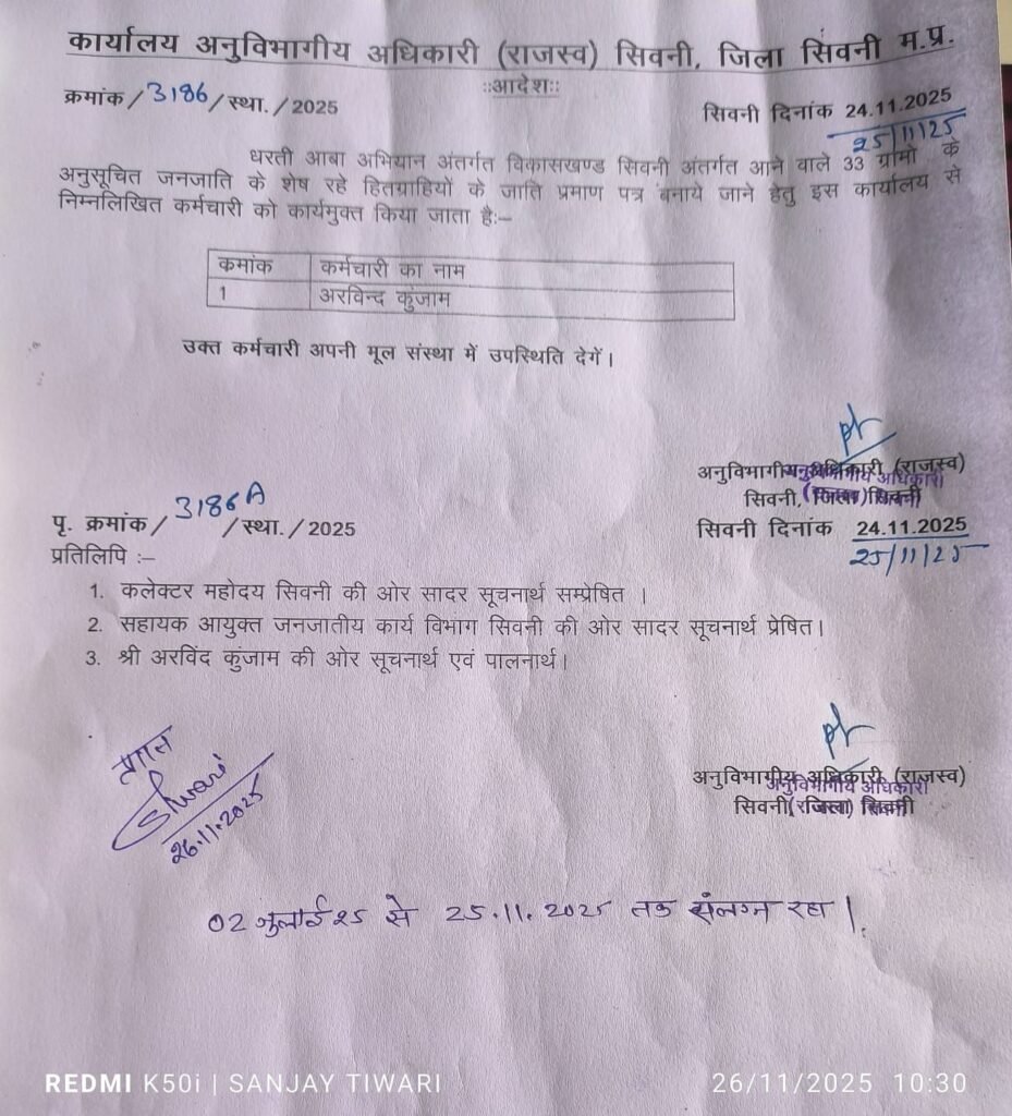 सिवनी। शासकीय माध्यमिक विद्यालय भोंगाखेड़ा सिवनी में पदस्थ चपरासी अरविंद सिंह कुंजाम् को जुलाई माह से एस डी एम कार्यालय में संलग्न किया गया था, जिसके कारण स्कूल का काम प्रभावित हो रहा था। ताजा समाचार पोर्टल न्यूज में “स्कूल में पीने के पानी के लिए तरस रहे बच्चे, एसडीएम कार्यालय में संलग्न है चपरासी” शीर्षक से मंगलवार दोपहर को खबर पब्लिस्ट की गई। खबर का असर हुआ और बुधवार को कलेक्टर ने स्कूल में ही पदस्थ किए जाने के आदेश आज जारी कर दी।