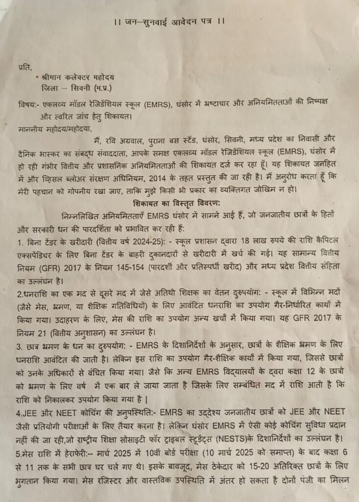पूर्व प्राचार्य ने स्वयं की थी शिकायत – खास बात यह है कि एकलव्य आदर्श आवासीय विद्यालय घंसौर के पूर्व प्राचार्य विष्णु स्वामी ने स्वयं लेखापाल कीर्ति सिहाग व जेएसए अमन द्वारा पद तथा अधिकार का दुरूपयोग कर मनमाने तरीके से व्यक्तिगत हित के लिए शासकीय अभिलेखों छेड़खानी करने संबंधी शिकायत 23 अप्रैल 2025 को जनजातीय कार्य विभाग के सहायक आयुक्त को प्रेषित की थी। इस पर तत्कालीन सहायक आयुक्त ने क्षेत्र संयोजक पूजा उइके की अध्यक्षता में तीन सदस्यीय दल गठित कर, विद्यालय में उपलब्ध दस्तावेजों की जांच व रोकड़ पंजी का परीक्षण कराया था, जिसमें कई त्रुटियां व अनियमितताएं पाई कार्रवाई नहीं होने तथा विभिन्न बिन्दुओं पर, पृथक से जांच करने की मांग करते हुए शिकायतकर्ता रवि अग्रवाल ने जनसुनवाई में कलेक्टर को शिकायत दी है।
