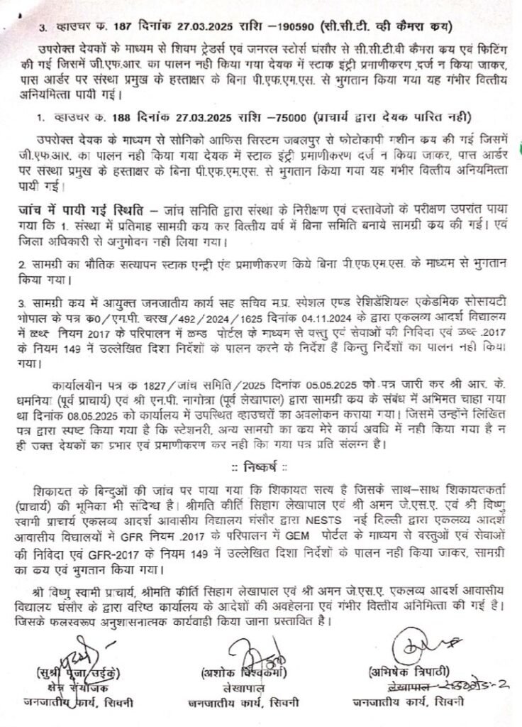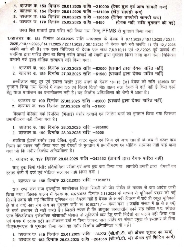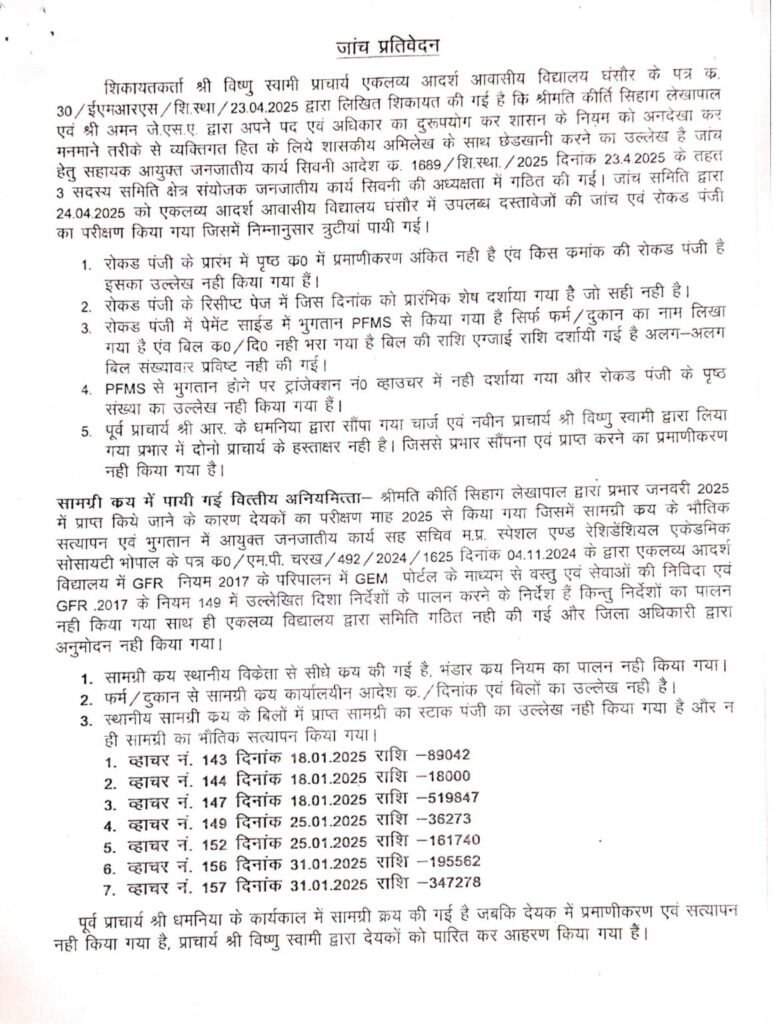 विद्यालय समिति का नहीं किया गठन – जांच प्रतिवेदन में पाया गया कि जेम पोर्टल से वस्तु एवं सेवाओं की निविदा में निर्देशों का पालन नहीं किया गया। एकलव्य विद्यालय द्वारा समिति गठित नहीं की गई और जिला अधिकारी द्वारा अनुमोदन नहीं किया गया। सामग्री सीधे स्थानीय क्रेता से सीधे क्रय की गई, भंडार क्रय नियमि का पालन नहीं किया गया। पूर्व प्राचार्य आरके धमनिया के कार्यकाल में सामग्री क्रय की – गई जबकि देयक में प्रमाणीकरण व सत्यापन नहीं किया गया। प्राचार्य विष्णु स्वामी द्वारा देयकों को पारित कर आहरण किया गया। जांच में छब्बीलाल साहू टूर एवं ट्रेवल्स को भ्रमण के नाम पर 1.23 लाख – रुपये का भुगतान किया गया लेकिन में वाहन क्रमांक व कितने किसी चला यह दर्ज नहीं है। फर्नीचर, वाटर कुलर व फ्रिज देयकों आदि खरीदी में भंडार क्रय नियमों का पालन नहीं किया गया। किताब खरीदी में भी गड़बड़ी की गई है। घंसौर के एक बुक डिपो से 342492 रुपये की प्रतियोगिता. परीक्षा एवं अन्य बुकों को क्रय किया गया। लायब्रेरी प्रभारी द्वारा देयकों का स्टाक पंजी में दर्ज व भौतिक सत्यापन नहीं किया गया।