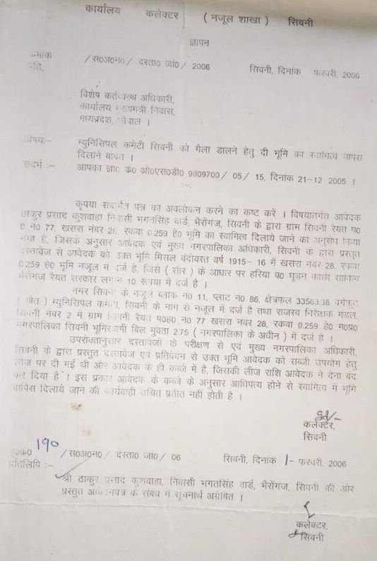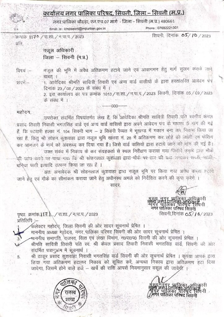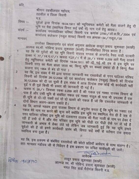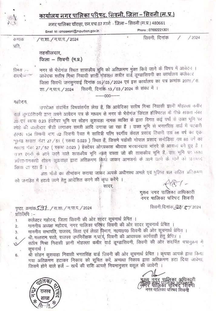 सिवनी। एक और जहां शासन प्रशासन अतिक्रमण हटाने के लिए लगातार प्रयासरत है शासकीय भूमि पर किए गए कब्जा को हटाकर करोड़ो की शासकीय भूमि अतिक्रमण मुक्त कराई जा रही है वहीं शहर के बीचों बीच हृदय स्थल भैरोंगंज में नगर पालिका की लगभग एक एकड़ नजूल भूमि जिसका खसरा नम्बर 28 और रकबा 0.259 हेक्टेयर है पर दबंगों सोहन कुशवाहा, गज्जू कुशवाहा और परिवार द्वारा कब्जा कर कालोनीवासियों का रास्ता बंद दिया गया है ।