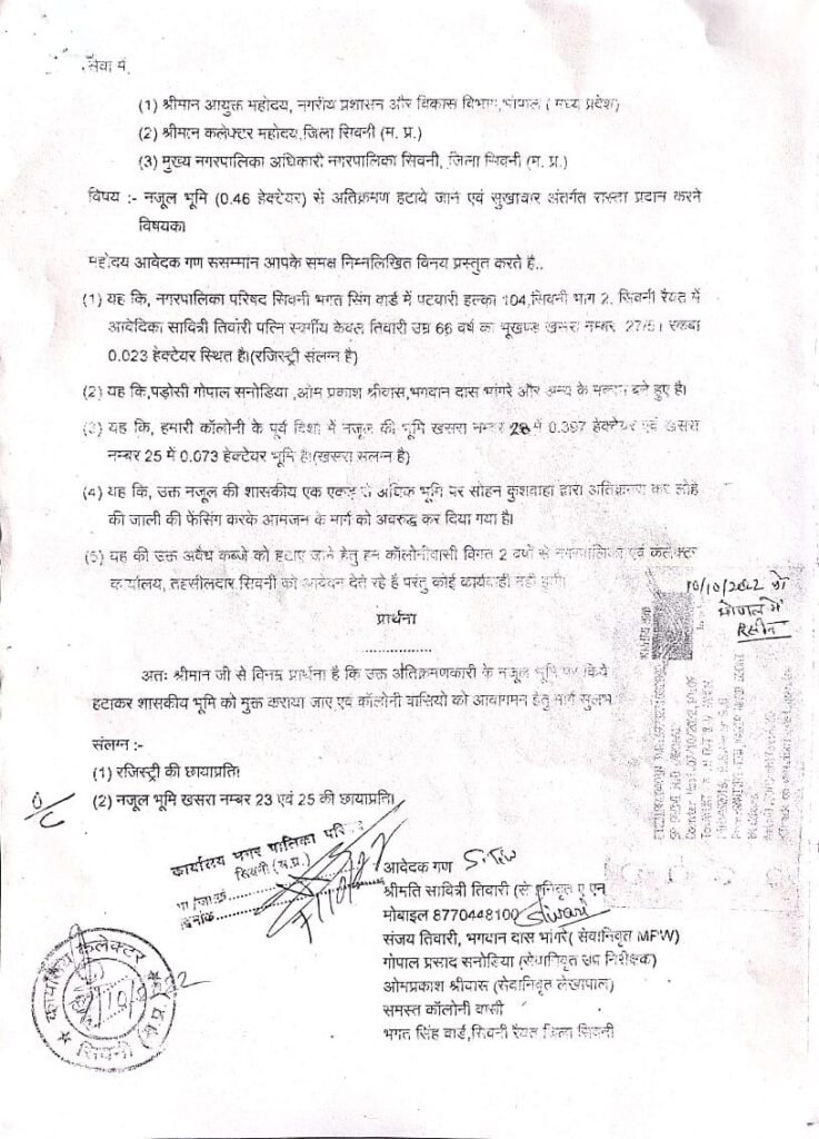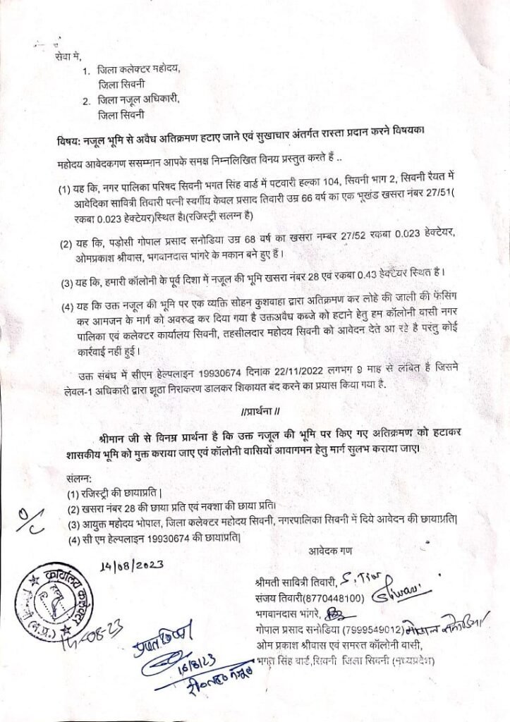 कालोनीवासियों ने जिले की संवेदनशील कलेक्टर से निवेदन किया है की उक्त अतिक्रमण को हटाकर सुखाचार के अंतर्गत उन्हें रास्ता प्रदान करने की कृपा करें।