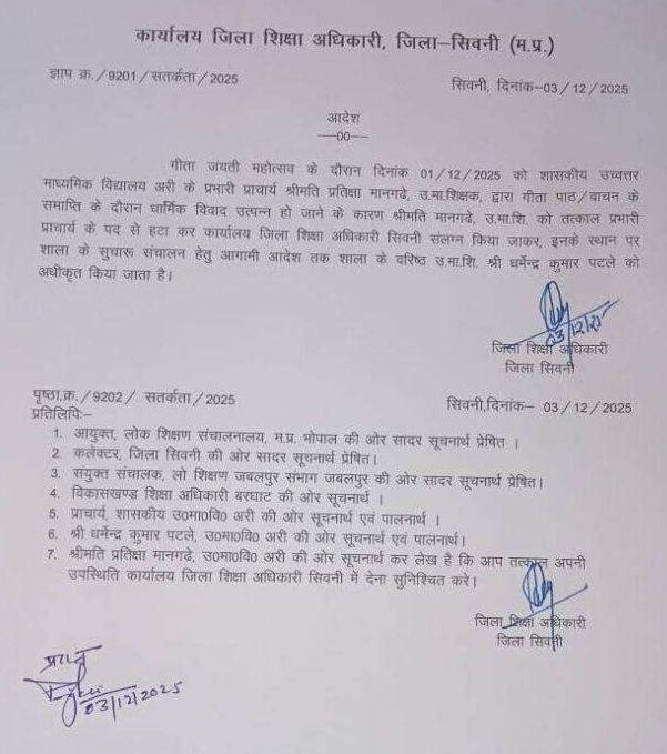 प्राप्त जानकारी के अनुसार एक दिसंबर सोमवार को गीता जयंती के उपलक्ष्य में विद्यालय परिसर में चल रहे कार्यक्रम में प्रभारी प्राचार्य श्रीमती प्रतीक्षा मानगढ़े द्वारा हिंदू बच्चों पर दबाव डालकर कथित रूप से 16 बार अल्लाह हूं, अकबर के नारे लगवाए गए। जिसके कारण संपूर्ण हिंदू समाज की धार्मिक भावनाएं आहत हुई एवं प्राचार्य द्वारा लगातार सोशल मीडिया में हिंदू विरोधी पोस्ट डालती रहती हैं। विश्व हिंदू परिषद प्रांत धर्म प्रसार प्रमुख ने अरी थाना में लिखित शिकायत देते हुए शासकीय उच्चतर माध्यमिक विद्यालय अरी की प्राचार्य श्रीमती प्रतीक्षा मानगढ़े के खिलाफ उचित कानूनी कार्यवाही कर एफआईआर दर्ज करने की मांग की है वही उन्होंने लिखित शिकायत में लिखा की कार्रवाई नहीं किए जाने पर विश्व हिंदू परिषद उग्र आंदोलन करने के लिए बाध्य होगा।