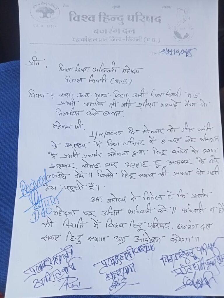 सिवनी। शासकीय उच्चतर माध्यमिक विद्यालय अरी तहसील बरघाट के स्कूल की प्रभारी प्राचार्य श्रीमती प्रतीक्षा मानगढ़े को निलंबित किए जाने की मांग विश्व हिंदू परिषद में की है। इस संबंध का ज्ञापन अरी थाना में सोपा गया। जहां थाने में पदस्थ एएसआई शैलेंद्र तिवारी ने उक्त ज्ञापन को लिया।
