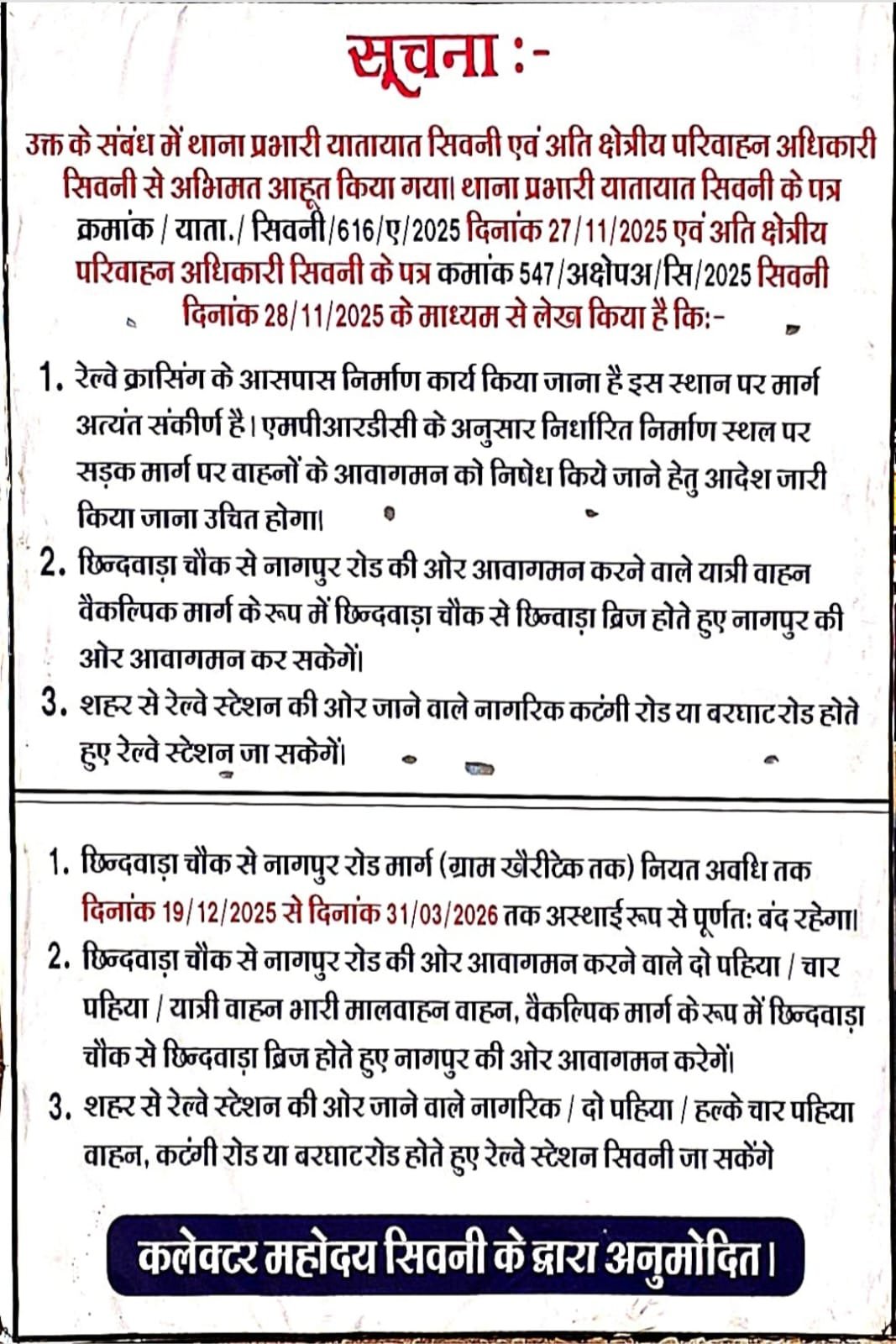 सिवनी। नागपुर रोड पर निर्माणाधीन रेलवे ब्रिज के कार्य के दौरान आम नागरिकों की सुरक्षा एवं संभावित दुर्घटनाओं को रोकने के उद्देश्य से मार्ग को अस्थायी रूप से बंद किया गया है। अनुविभागीय दण्डाधिकारी के आदेश के तहत लागू किया गया है। आदेश के अनुसार छिंदवाड़ा चौक से नागपुर रोड (ग्राम खैरीटेक की ओर) जाने वाला मार्ग 19 दिसंबर 2025 से 31 मार्च 2026 तक पूर्णतः अस्थायी