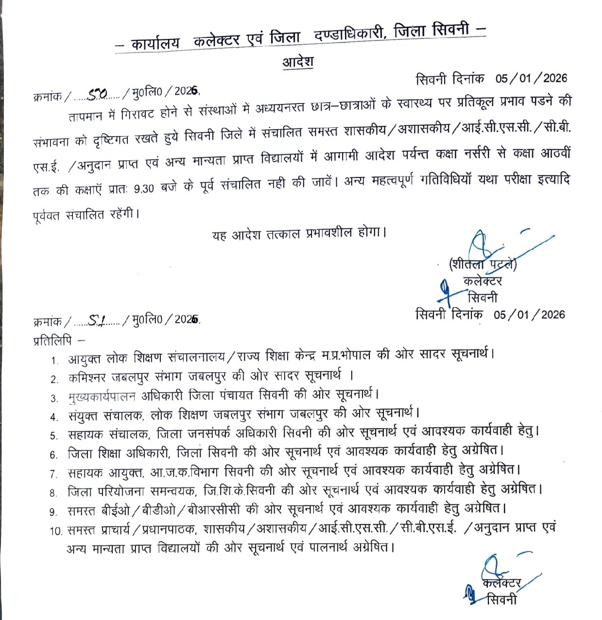 तापमान में गिरावट होने से संस्थाओं में अध्ययनरत छात्र-छात्राओं के स्वास्थ्य पर प्रतिकूल प्रभाव पडने की संभावना को दृष्टिगत रखते हुये सिवनी जिले में संचालित समस्त शासकीय/अशासकीय/आई.सी.एस.सी./सी.बी. एस.ई. / अनुदान प्राप्त एवं अन्य मान्यता प्राप्त विद्यालयों में आगामी आदेश पर्यन्त कक्षा नर्सरी से कक्षा आठवीं तक की कक्षाएँ प्रातः 9.30 बजे के पूर्व संचालित नहीं की जायें। अन्य महत्वपूर्ण गतिविधियों यथा परीक्षा इत्यादि पूर्ववत संचालित रहेंगी।