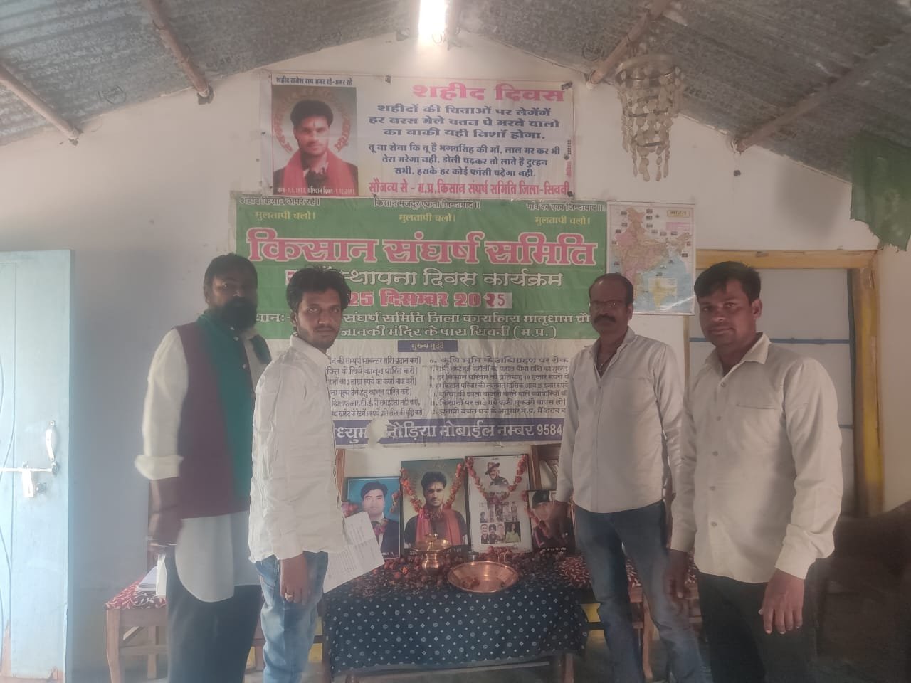 सिवनी। प्रतिवर्षानुसार इस वर्ष भी 2 फरवरी दिन सोमवार को किसान संघर्ष समिति के जिला कार्यालय में शहीद राजेशराय पलारी के साथ शहीद शैलेश वर्मन बंडोल, शहीद भूरासिह बघेल जैतपुर ,शहिद नितेश मिश्रा गंजवार्ड सिवनी , शहीद सी डी एस बिपिन रावत एवं अन्य शहीद साथियों को डा राजकुमार सनोड़िया की उपस्थिति में श्रद्धांजलि अर्पित कर पुष्प माला दीप प्रज्वलित श्रीमति पिंकी सनोडिया द्वारा किया गया।