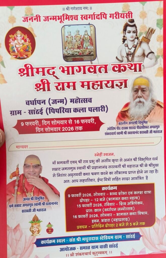 सिवनी। विकासखंड केवलारी के अंतर्गत ग्राम – सांढई (पिपरिया कला पलारी) में सोमवार 9 फरवरी से सोमवार 16 फरवरी तक अनंत श्री विभूषित धर्म सम्राट जगतगुरू स्वामी श्री प्रज्ञानानंद सरस्वती श्री महाराज श्री के श्रीमुख से निरंतर अमृतमयी कथा श्रवण करने का सौभाग्य श्रद्धालुजनों को होगा।
