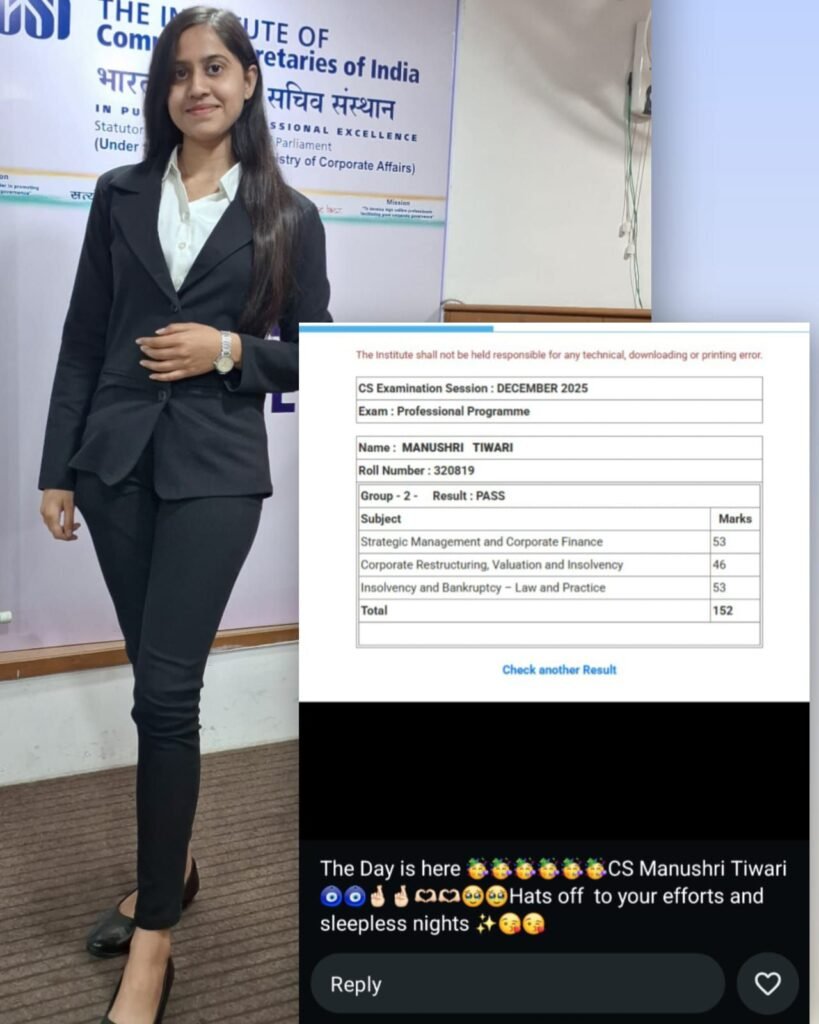 सिवनी/जबलपुर। सिवनी नगर के भैरोगंज व वर्तमान में विजयनगर जबलपुर निवासी श्रीमती मीनाक्षी-मनोज तिवारी की सुपुत्री कु. मनुश्री तिवारी ने कंपनी सेकेट्री ऑफ इंडिया की परीक्षा में सफलता प्राप्त की है।
