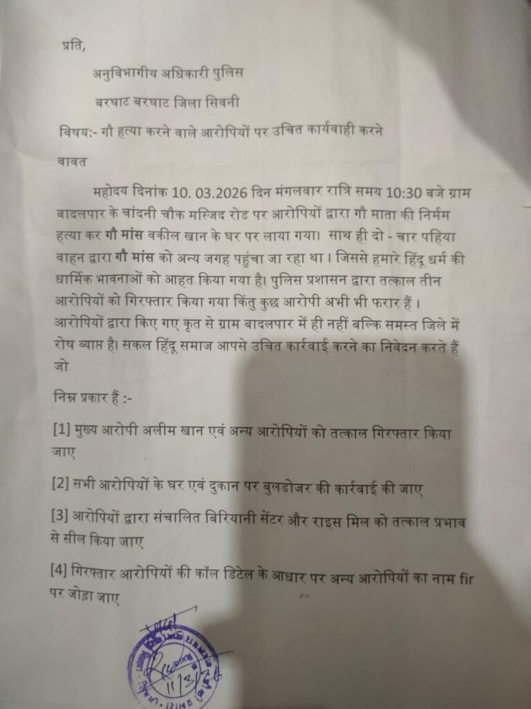 मंगलवार 10.03.2026 रात्रि समय 10:30 बजे ग्राम बादलपार के चांदनी चौक मस्जिद रोड पर आरोपियों द्वारा गौ माता की निर्मम हत्या कर गौ मांस वकील खान के घर पर लाया गया। साथ ही दो चार पहिया वाहन द्वारा गौ मांस को अन्य जगह पहुंचा जा रहा था। जिससे हमारे हिंदू धर्म की धार्मिक भावनाओं को आहत किया गया है। पुलिस प्रशासन द्वारा तत्काल तीन आरोपियों को गिरफ्तार किया गया किंतु कुछ आरोपी अभी भी फरार हैं। आरोपियों द्वारा किए गए कृत से ग्राम बादलपार में ही नहीं बल्कि समस्त जिले में रोष व्याप्त है। नागरिकों ने आरोपियों के नाम लिखकर पुलिस अधिकारी को ज्ञापन सौंप कर कार्यवाही की मांग भी की है।