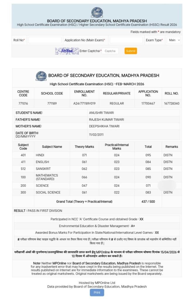 सिवनी/लखनादौन। राजेश तिवारी शिक्षक उत्कृष्ट विद्यालय लखनादौन एवं श्रीमती शिखा तिवारी शिक्षक निवासी महाराज बाग की सुपुत्री अनुश्री तिवारी ने दसवीं कक्षा में 437/500 अंक लेकर उत्कृष्ट स्थान प्राप्त किया है।