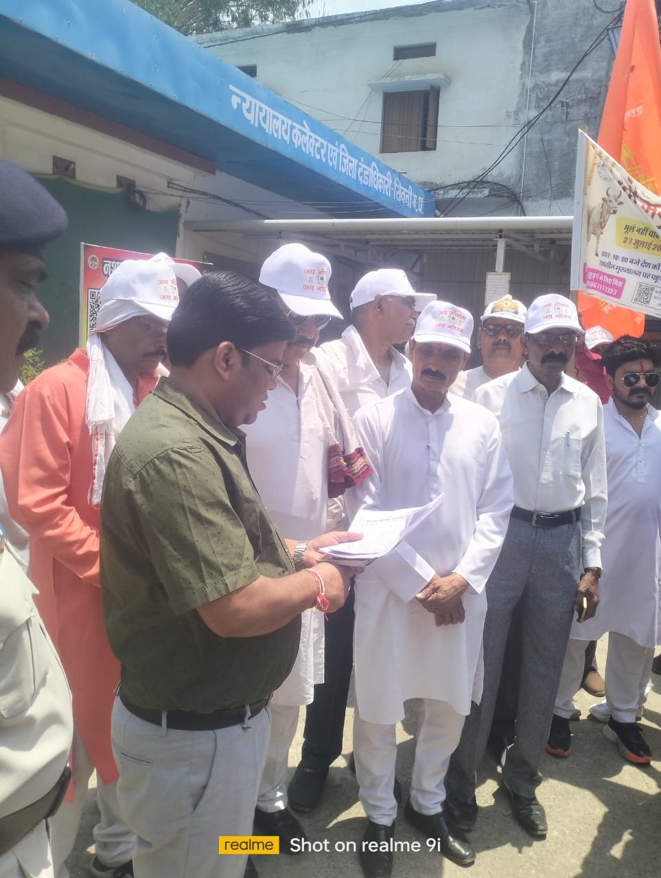में झंडे-बैनर लेकर ‘गौ माता के सम्मान’ में नारे लगाते हुए जिला कलेक्ट्रेट परिसर पहुंचे।